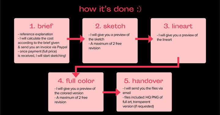 Process will be divided into 5 stages as described above. SKETCH, LINEART, and COLORING will take around 5 to 7 days.